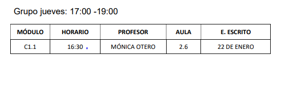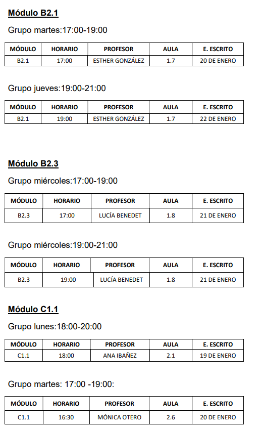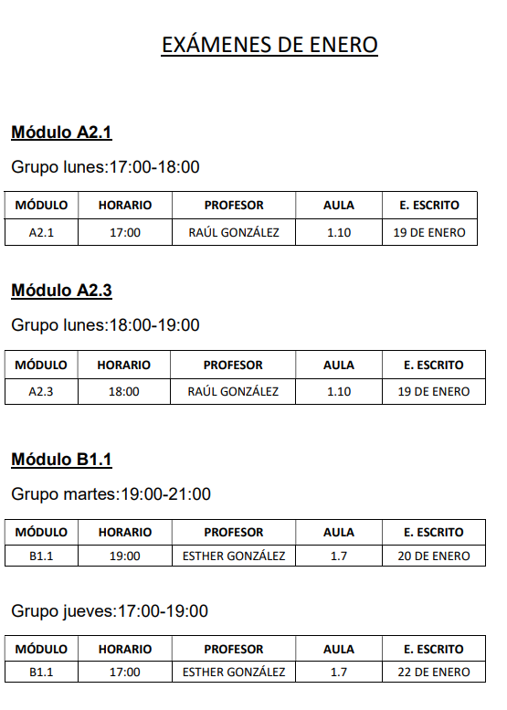 Los exámenes escritos se realizan en enero la semana del 19 al 22 de enero. El examen se realiza el día y a la hora de la tutoría habitual. Las notas serán publicadas en Centros net: